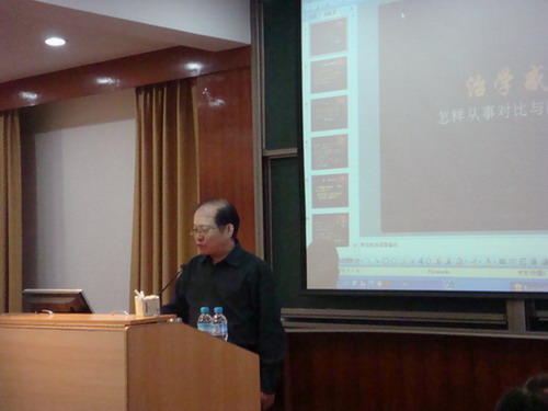 潘教授首先开门见山和大家探讨了创新研究的四原则,即为创新的基础是继承,创新立足于本土学术资源,批判性地吸收外来新知和科学的思维方法。继而旁征博引从道器论的国学角度分析了中西研究方法的差异,指明中国乃”道器合一”即治学规律和方法融会贯通,而西方则道器分立,研究方法和问题一一对应,并引用经典总结了道和器的关系——“非器则道无所容”,“道不离器,犹影不离形”。关于治学之道,潘教授认为“为人先于为学”,同时具有“德”“学”“才”“识”,才是一个优秀的研究者应该兼备的素质。对于《周易》中的关于道的解释,潘教授也自有一番创新观点,他引经据典,幽默阐释,大家频频点头,受益匪浅。