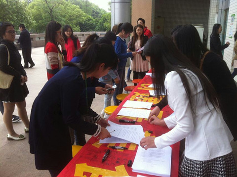 ![]() 本次活动由两部分组成:首先是前期的志愿者招募活动,鼓励大家踊跃报名,截止日期为4月11日;然后是4月13日中午的现场签名会。可见研会工作人员的准备工作做得十分完善。签名会现场,一条醒目的写满字的红色条幅,和不断重复播放的喇叭吸引着来来往往的同学走向前来询问,然后签字。参与活动的同学们均对本次活动表示理解和绝对的支持。一位同学说“就餐环境直接影响到我们的健康,十分重要,希望每个同学就完餐都能直接把餐具送到回收处,保持食堂卫生。”另一位同学说“主动送餐具本来就是就餐同学的义务,却偏偏要劳烦清洁阿姨来回收,实在不像是大学生的作为。”