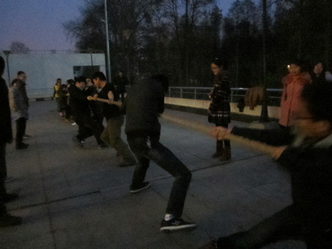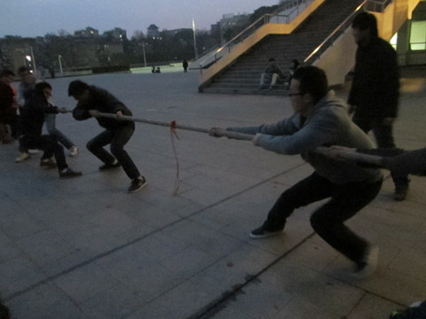 2014年3月13日晚,华中师范大学佑铭体育馆旁边不时传来阵阵欢笑声。原来由外国语学院研究生会,信管学院研究生会和社会学院研究生会联合举办的跨院趣味比赛之拔河比赛正在热烈地进行着。本次比赛本着“自愿参与,快乐为主”的宗旨进行,吸引了众多同学踊跃参与。