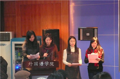 朗诵会由聂振钊教授致开幕辞,并朗读了中美诗歌诗学协会会长马乔瑞•帕罗夫和副会长查尔斯·伯恩斯坦为此发来的贺词,在贺信中他们感谢09年11月访问宾夕法尼亚大学的湖北诗人并期待今年九月的再次合作。朗诵会活动内容丰富,形式多样,来自外国语学院、文学院的老师、博士和硕士研究生齐聚一堂,分享他们原创或喜欢的诗歌。有中英双语朗诵、配乐朗诵;有个人单独朗诵也有双人、多人组合朗诵。诗歌语言包括中文、英语、日语和马来西亚语,同样,诗歌内容也丰富多彩,有歌颂春天的美景也有感怀秋天的萧瑟;有回忆初恋的甜蜜也有表达对逝去的亲人的哀思;有的诗歌充满乡村意象,描绘了一幅质朴宁静的乡村图画,也有的弥漫着城市夜晚的孤独。朗诵会最后,胡亚敏教授致闭幕词。