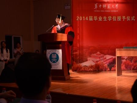 6月16日上午,外国语学院2014届毕业生毕业典礼暨学位授予仪式在大学生活动中心五楼举行。华中师范大学校党委副书记谢守成、外国语学院院长廖美珍、院党委书记李云、副院长李俄宪、副院长高晓芳、副院长罗良功、院党委副书记张静以及各系系主任出席。400多名本科生和研究生毕业生参加。毕业典礼由2014届毕业生王滢琪主持。