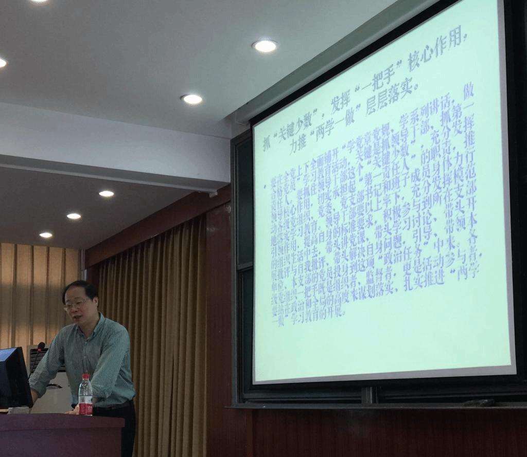 2016年5月13日,为了将“两学一做”学习教育与全面贯彻党的教育方针结合起来,与落实立德树人根本任务结合起来,同时在学院进一步营造清风正气,严守政治纪律政治规矩的良好氛围,院党委紧扣“两学一做”要求,联系教工党员思想、工作、生活和作风实际,在3408教室举行了“两学一做”学习教育专题党课。此次专题党课由李云书记主讲,学院全体教职工党员参加。 李云首先介绍了“两学一做”学习教育的意义。“两学一做”学习教育是决胜全面建成小康社会的重要保障;是赢得“具有许多新的历史特点的伟大斗争”新胜利的政治条件;是全面从严治党的新举措;是群众路线教育实践活动和“三严三实”专题教育的深化和发展。对于推动全面从严治党向基层延伸,保持发展党的先进性和纯洁性,具有十分重要的意义。 紧接着,李云介绍了“两学一做”学习教育的总体目标和具体要求。李云指出,按照学院党委学习计划的要求,各支部前一段时间已就开展“两学一做”学习教育进行了布置与安排,要求支部每位党员认真学习党章和相关学习材料,目前,部分党支部开展了专题组织生活会;下一步根据学校党委的要求和学院的学习安排,每个党支部将都要进行专题组织生活会,每位党员都要按照个人自评、党员互评、民主测评、组织评定,查摆了思想、组织、作风、纪律等方面存在的问题。同时,各党支部要围绕“明职责、抓规范、创品牌”这个主题,开展“特色党日”活动,将明德修德、立德树德作为特色党日活动的重要内容,进一步深化学院师德师风建设,打造一支富有战斗力的师资队伍。 最后,李云希望全体教职工党员要始终保持干事创业、开拓进取的精气神,在实现学院“十三五”规划良好开局、深化综合改革中奋发有为、创先争优。