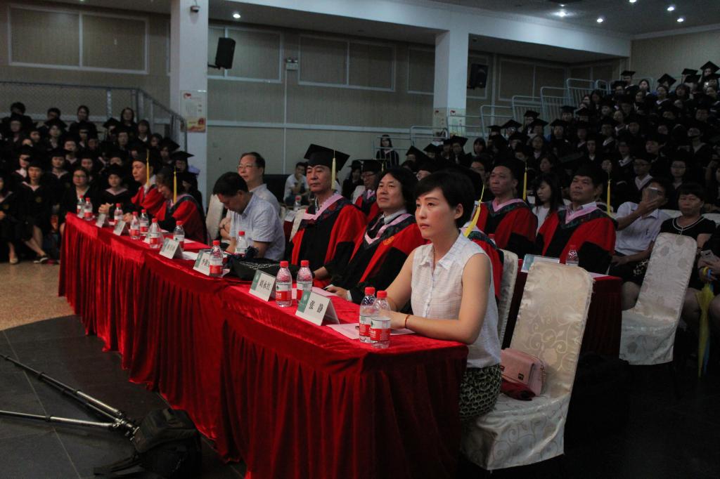 典礼开始后,全体师生奏唱国歌。在庄严的国歌声落下后,外国语学院院长、博士生导师廖美珍教授致辞。廖教授从同学们四年来点点滴滴的成绩感叹光阴似箭,并给予了毕业生们真挚的祝福。外籍专家Steven Tracy教授以一段节奏欢快的口琴作为致辞的开场与结束,迎来同学们的欢呼与掌声。随后,2016届优秀硕士毕业生代表向晨以及2016届优秀本科毕业生代表马思思发言,他们表达了对老师悉心教导的感恩之情,也表达自己对学校的不舍以及对未来的展望。