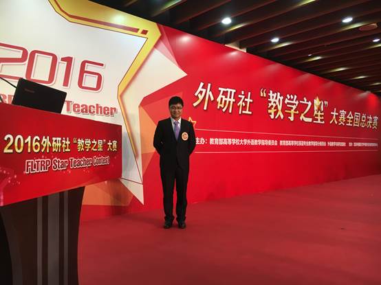 (颁奖嘉宾给亚军颁奖,右起第二为王建洋老师) “教学之星”大赛全国总决赛于12月9日举行,29位参赛教师在总决赛的舞台上通过“微课”展示、基于微课的翻转课堂设计“说课”以及针对教学设计展开的“评委问答”三个环节展开对决。王建洋老师为19号选手,题为A glimpse of Confucius’teaching philosophy的五分钟微课选题精准,基于我校师范大学的特色,结合中国传统艺术沙画生动有趣地阐释了孔子的教学理念;五分钟说课环节中,他向评委和观赛师生们呈现了逻辑缜密、行之有效的翻转课堂;在最后基于翻转课堂设计的现场评委两分钟提问环节,他思路清晰,镇定自若而又巧妙地回答了两位评委所提的问题,获得现场评委和观众的一致好评。 2016“教学之星”大赛于5月启动,总决赛前历经了6月的初赛和7-8月的复赛。“教学之星”大赛是由教育部高等学校大学外语教学指导委员会、教育部高等学校英语专业教学指导分委员会和外语教学与研究出版社共同举办,面向高等院校外语教师的大型公益赛事,旨在切实提升高校外语教学质量,推动我国高校外语师资队伍建设,提高教师教学设计能力,促进教师专业发展,以适应国家和社会对高校外语教学要求的变化。2016年,大赛以“让精彩设计在知识和人心之间架起一座桥梁”这一理念为指导,引导教师为实现有效学习(Effective Learning & Efficient Learning)而进行教学设计,鼓励教师成为教学的设计师,以学习效果为目标,以先进理念为指导,面对新时代大学生,将恰当的教学方法与设计融入课堂教学实践,使课堂新颖、紧凑、有效、充满吸引力,从而提升教学效率与效果,实现有效学习,让精彩设计在知识和人心之间架起一座桥梁。