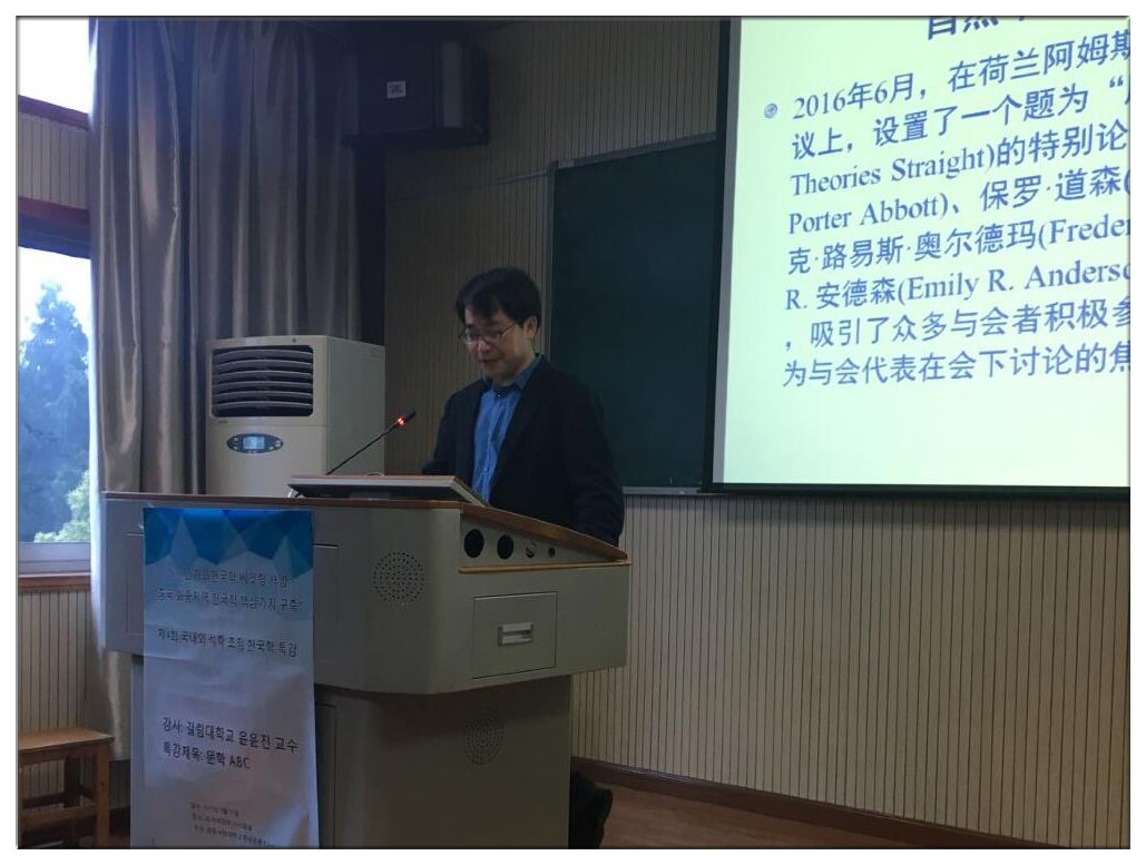 2017年4月25日下午,上海交通大学外国语学院尚必武教授为外院师生作了题为:“当代英国小说的非自然叙事:范式、作品与阐释”的学术讲座。外国语学院徐彬教授担任此次讲座的主持人,英语系主任方幸福教授出席了这次讲座,外院英语专业研究生、博士生踊跃参与并在讲座之后积极提问,讲座现场气氛活跃。 在梳理非自然叙事学产生背景的基础上,尚必武教授指出:一、叙事学的目的在于如何科学地考察作者讲述故事的方式,分析作品内在叙事结构,在此基础上讨论作者的叙事技巧和动机;二、非自然叙事学已经成为叙事学理论中一个激动人心的新领域,为文学研究提供了新方法。针对“小说是否已经死亡”的论题,尚教授还指出以Zadie Smith和David Mitchell等为代表的当代英国新生代作家的创作证明小说非但没有死还以更多更好的叙事形式展现出勃勃生机;面对当代小说的勃兴,文学评论家们应该具有一定的历史使命感。此后,尚教授提出非自然叙事中的五大非自然因子,并对这些非自然因子逐一举例说明。讲座过程中,尚教授展现出深厚的叙事学理论功底和文本分析能力,帮助华师师生扩宽了文学研究的视野。 徐彬教授对尚教授讲座的点评是:“尚教授的非自然叙事理论观点走在国际前沿。尚教授的知识储备广博,文学批评的审美取向别具一格。”。 讲座结束后,方幸福教授就“俄罗斯形式主义中的陌生化一说与非自然叙事的异同以及非自然叙事中的意识形态等问题”,博士生朱喜奎同学就“经典文学作品中的非自然叙事现象”向尚教授提问,均得到尚教授的详细解答。参加本次讲座的师生获益匪浅。