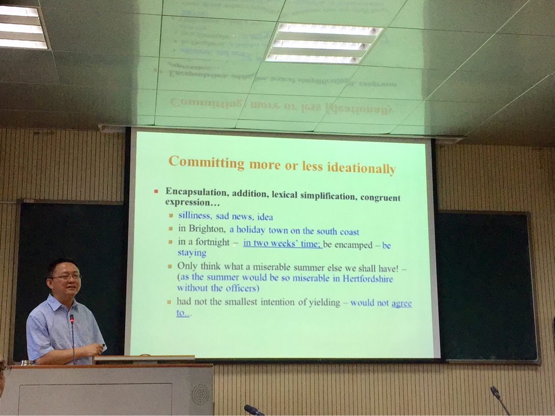 常晨光教授是中山大学外国语与翻译大学院副院长,博士生导师。主要研究方向为功能语言学、应用语言学、澳大利亚研究。近年来发表外语教学研究、词典编纂、功能语言学与语篇分析等方面的论文30余篇。编著、译著10余部。 常晨光教授的讲授主要介绍从系统功能语言学的角度研究翻译,强调翻译过程中原文和译文在同一语境中要注重功能的对等,同时强调了翻译的“再实例化”(Re-instantiation),从Coupling和Commitment两个角度进行分析,并以《傲慢与偏见》为例,从人际意义、概念意义和语篇意义对原文译文进行了对比分析。 讲座结束后,常教授对师生们提出的问题,耐心地进行了解答。最后王勇教授对常教授的讲座作了精彩点评。讲座为我院师生提供了一种不同于传统的、基于功能语言学视角和方法进行翻译研究,大家收获颇多。