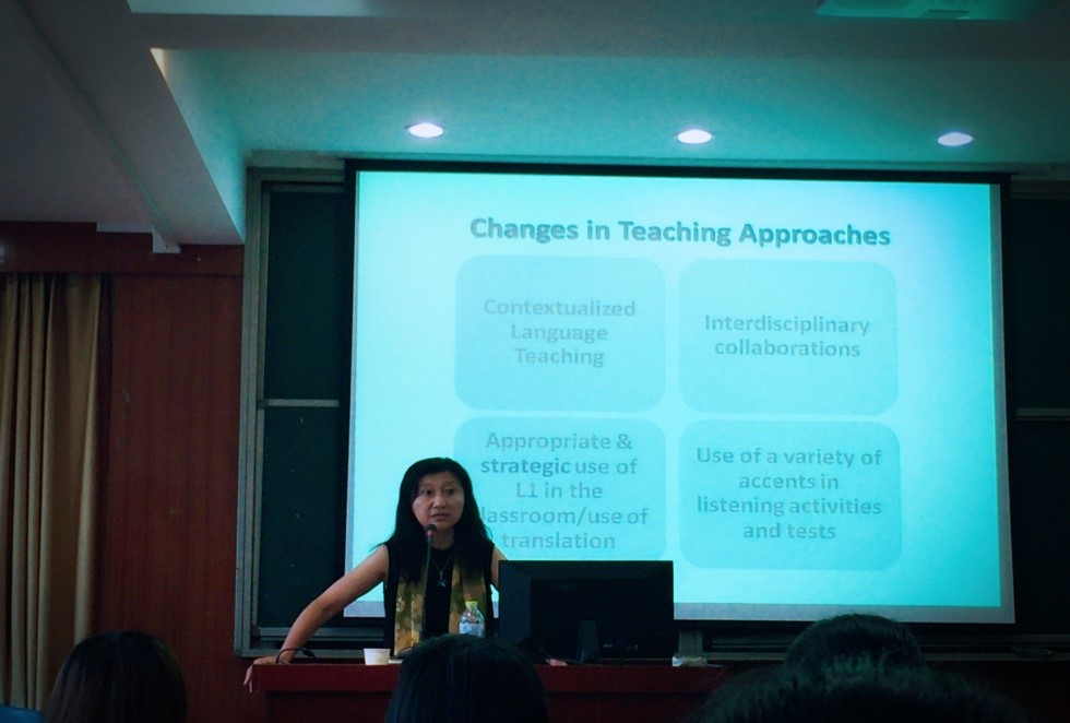 2017年6月9日上午九点半,由外国语学院教师教育中心主办的学术交流活动顺利开展,此次活动受邀嘉宾是来自澳门大学英语语言中心的主任Yilin Sun教授,她的报告题目为“Transcending Boundaries in Glocalized ELT Field: Trends andImplications”。参加此次学术交流活动的有闫春梅等教师代表,16级全日制教育硕士全体成员以及外国语学院其他专业的部分学生。