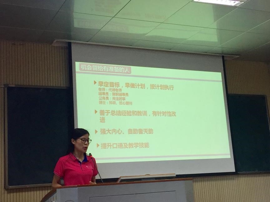 廖菲简介 曾担任外研会副主席,14级语言学班班长,2014级英语系本科生兼职辅导员。 发表过两篇学术论文,获得国家奖学金,优秀研究生干部、科研积极分子等荣誉,现签约武汉商学院。 廖菲在短短的十几分钟内向同学分享了一波波“干货”:向15级即将面临就业的同学强调了简历的重要性,介绍了一些查询就业信息的网站,和平常大家要注重的知识储备。向16级的硕士生强调了学习的重要性,建议大家平时广泛阅读。