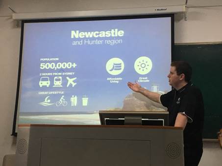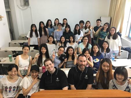 孔子学院远客来 6月26日上午来自澳大利亚纽卡斯尔大学的孔子学院访问团访问我校,我院师生负责全程接待。学院在3408教室对访问团举行欢迎仪式,来自翻译1406及1407班的6位同学分别从华师、武汉等角度为访问团成员作了生动有趣的英文介绍。欢迎仪式过后,各班第一组成员将访问团成员带回3113与3114教室,分班进行中外学生交流。同学们从华师的特色文化和建筑谈到武汉的名胜古迹和历史发展,访问团成员也和各位学生积极交流,学习到几句地道的普通话和武汉方言表达;我院同学也为澳方成员准备了问题,对澳洲学风景名胜、民风民俗及学习环境讨论热烈,期间笑声阵阵,大家都乐在其中。其中来自翻译7班的黄凯同学接受班级同学邀请,上台为澳方成员表演了三首歌曲;澳方成员也分享了纽卡斯尔大学的风景和建学背景,为在座的同学带来澳洲当地美食,并给提问的同学赠送了纽大校帽。中澳双方学生都展示了最真诚的热情,合照中的他们脸上都绽放着笑容,在这炎热的江城夏季给2014级翻译系见习画上了圆满的句号。见习结束前,同学们都用心用文字记录此次暑期见习,用图文并茂的方式给自己的暑期留下最深刻的记忆。