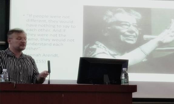 随后王黎老师做了简单介绍,讲座在两点正式开始。教授在讲座中介绍了跨文化能力两种不同的模式:即理论型赫尔辛基模式和反思式北京—赫尔辛基模式,这两种模式既互为补充又有重叠。Dervin教授首先介绍围绕“跨文化能力”一词讨论了什么是跨文化能力及其相关问题,接着又介绍了关于跨文化所应当注意的四点以及赫尔辛基模式的六个原则。