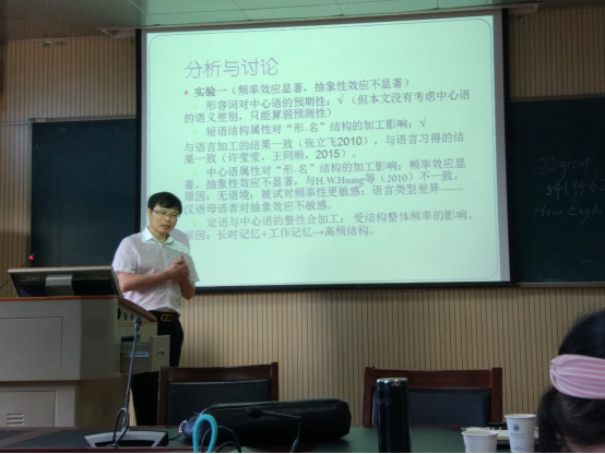 通过对文献的梳理,周教授发现汉语的实证研究很少,很多问题有待解决。比如,“的”字隐现是否影响定中结构加工?结构的语义透明度如何影响加工?抽象性效应和频率效应是否影响加工?针对以上问题,周教授开展了定中结构的加工实验:self-paced范式,通过两个实验:形-名结构的加工研究和名-名结构的加工研究,得出结论:定中结构的架构受多重因素的影响;“的”字隐/现影响定中结构的加工,同时与结构的语义类型存在交互作用等。
