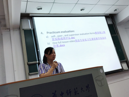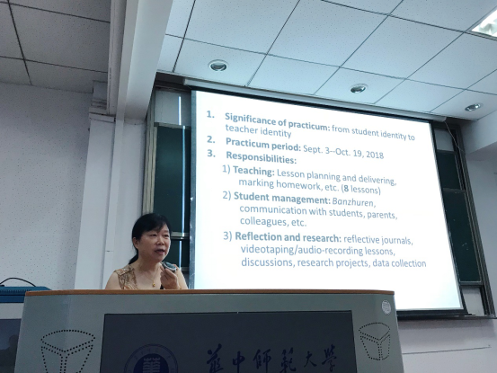 闫春梅教授以“Swim in the water”为题,强调对2017级教育硕士的实习要求,要求做好从学生身份到教师身份的转变,提出我们不仅要做好教学,也要做好学生管理、班主任工作、反思与研究等。同时,闫春梅教授着重强调“态度”问题,认为要“concentrate on practicum”。