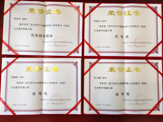 2018年9月21日—23日,第二届全国全日制教育硕士学科教学(英语)专业教学技能大赛(决赛)在鲁东大学成功举办。外国语学院文斌老师带领我院三名决赛选手赴山东烟台参赛,三位选手表现出色,取得了骄人的成绩。其中,侯忠义、彭露娇两位同学荣获一等奖,纪力源同学荣获二等奖,向宗平老师被评为优秀指导教师。