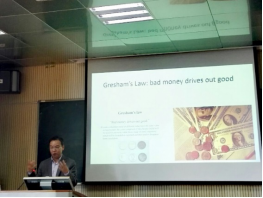 上午最后一场报告由华中师范大学董方峰博士带来。董老师的题目是“词语意义演变中国的劣币驱逐良币效应”。根据“语义演变的格雷欣定律”,在词语意义演变过程中,有些情况下意义原本积极或者中性的词语出现了新的消极意义,原有的积极或者中性意义则完全或者部分退出使用。他呼吁语言学习者对语义演化中的消极现象予以重视并积极引导。