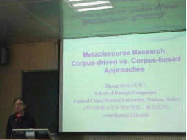 华中师范大学外国语学院的张曼教授在随后的报告中向大家展示如何基于语料库对语篇的元话语展开研究。张老师首先对元话语进行了简单定义,并提出语料库研究的两种方法。然后,她结合具体实例阐释了如何运用语料库驱动的方法来统计并归纳元话语标记语,并对研究结果进行了汇报和展示。