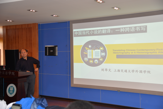 在现场师生的热烈气氛中,来自华中科技大学的王树槐教授分享了《红楼梦》文化传统的诗学比较,王教授将《红楼梦》杨、霍译本对比,以文化折射率谈及表层物质文化、中层制度文化等诸多方面,阐释了在文学翻译中须以交际传递原文信息效果作为一大衡量标准。 王树槐教授以《红楼梦》译文为例,展示了中国古代经典文学翻译的独特魅力,接下来,陈月红教授则从生态翻译出发,展示了译者的生态意识,并剖析其对建构国家环境形象的重要意义。陈教授任教于三峡大学,也在发言中谈及自己曾就读我校外国语学院,所以本次能受邀回到母校参加桂子山高层论坛,深表荣幸。