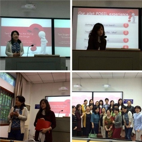 首先,谭娅老师为大家详细介绍了POGIL这种新的教学理念与方法,其全称是Process-Oriented Guided-Inquiry Learning(面向全过程的指导型探究学习法)。作为强调学习的自主性和社会性的教学策略和思想,POGIL的形成是建立在包括认知发展(cognitive development)、教学设计(instructional design)以及合作学习(cooperative learning)等多个领域的理论研究基础之上的。以学生与学习过程作为关注重点,通过课堂活动的有效设置促进学生合作学习,从而形成由概念探索、概念形成与应用三个环节构成的学习循环。在课程教学中应用POGIL,并不是教师将纷繁复杂的课程内容全盘传授,而是通过创设学生互助式的学习环境促进学生建构自己对相关课程内容的理解,并促使学生在掌握课程内容的同时发展活动过程中的关键过程技能(process skills),如批判性思维、问题解决、信息处理,、自我评估管理、人际沟通和团队合作等。两位老师对她们班实施了一个学期的教学进行分析和研究,她们认为POGIL教学模式将会有益促进大学英语教学质量与学生英语学习成效。
