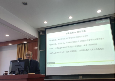 通过对中西方思维进行对比,主要包括中式思维的由远及近对比西方思维的由近及远,中式思维的形象思维对比西方思维的抽象思维,中式思维的整体思维对比西方思维的个体思维,以及中式思维的主体思维对比西方思维的客体思维,结合生动具体的例子和自己国外留学工作的亲身经历。比如提到他在美国的孔子学院工作时,有外国学生问到中国羊年的表达,羊究竟对应着英文里的哪种羊,指出了中国的整体思维和西方的个体思维的具体体现。然后又通过提到中国对于不同亲属清楚区分的称呼,比如表弟表哥,堂哥堂姐等,告诉大家中国并非没有个体思维,但是中西方的个体思维又不一样,中国对于称呼的清晰界定是源自古老中国文化的父系和母系社会的区分,由于西方社会没有这样的文化,所以类似的情况在西方社会就不会出现。易老师的讲座既解答了观众可能产生的疑问,又阐明了中西方整体思维和个体思维的差异,同时对比了中西方文化的不同。类似这样生动恰切的例子层出不穷,让听众在欢笑中清晰理解了中西方思维的差异,找到英语学习与教学努力的方向。