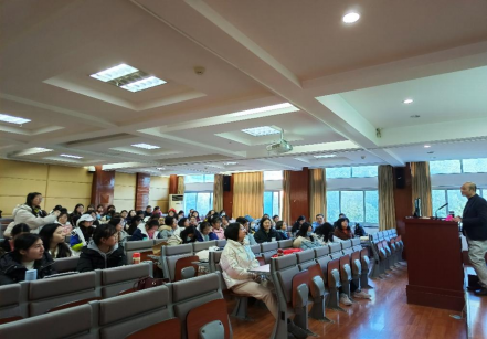 随后,易宏根老师用自己患着感冒给大家做讲座为导入,延伸到自嘲自己英文不地道,向大家求医问药,开场幽默风趣,引人入胜。易老师介绍自己英语学习上的“病史”,小学2年,中学6年,8年英语学习未出现任何问题,大学求学第一年成绩优异,第二年发现自己和外教的表达总是有出入,自己诊断出问题主要为:第一,“贫血”,即词汇量不足,以茶壶里倒饺子形象比喻了词汇量不足对于英语表达的阻碍;第二,“营养不良”,即不了解英语文化。易老师讲到自己从1989年至今,西方国家留学工作十几年,学习英语三十多年,词汇量丰富了,文化也比之前了解了,可是症状还未消失,从而引出病根,即症结在于思维方式的问题。