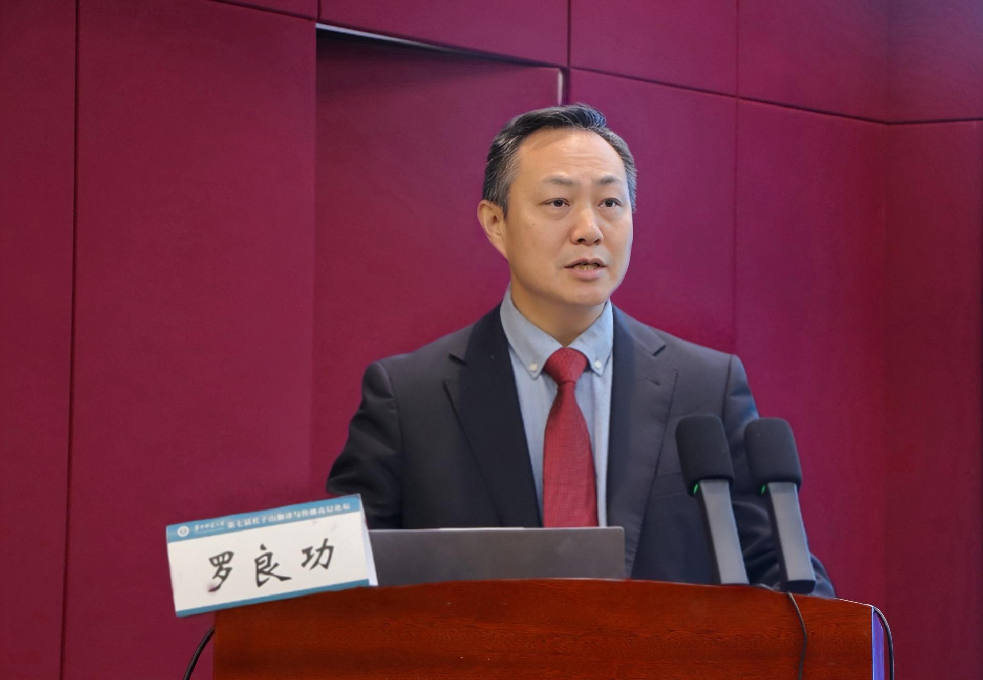 随后,华中师范大学外国语学院院长罗良功教授发表了开幕致辞。他首先概述了“桂子山翻译与传播高层论坛”的背景,明确本届论坛以人工智能和国际传播为核心议题,旨在探讨新时代下翻译与传播如何适应外语学科的发展和响应时代需求。罗院长强调了翻译在构建人类命运共同体中的关键作用,认为语言文化的协商性和价值情感的包容性不断赋予翻译传播以新的内容。最后,他指出本论坛的举办对于翻译和国际传播领域的发展如何把握时代脉搏、展现时代精神具有重大意义,并预祝大会取得圆满成功。开幕式由华中师范大学外国语学院副院长苏艳教授主持。