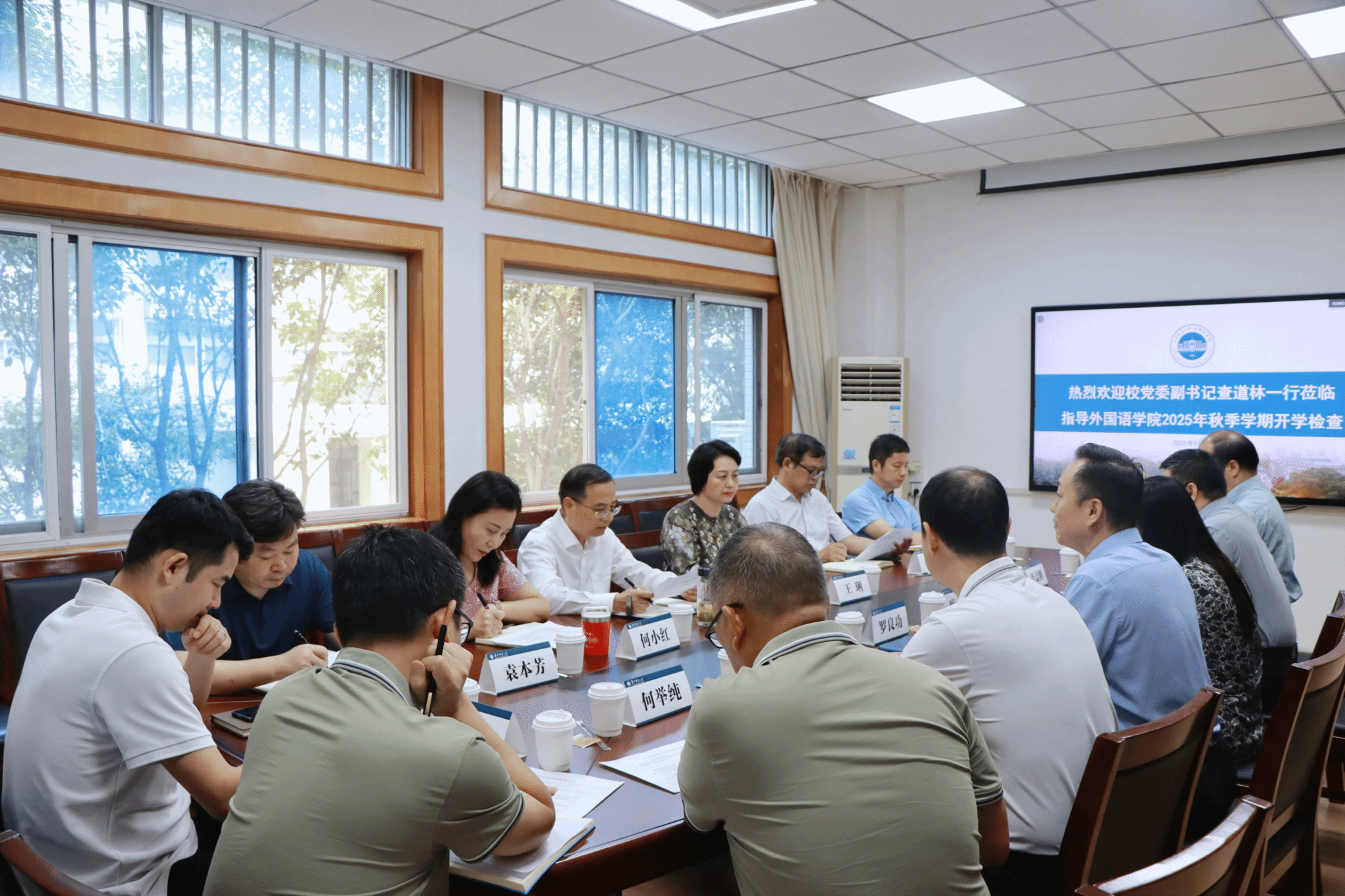 9月9日,校党委副书记查道林一行莅临外国语学院检查指导开学工作,校党委巡察办主任王琍、离退休工作处处长何小红、校工会常务副主席易仲芳、后勤保障部部长袁本芳、基建处处长邱玉华、校办刘志强出席,外国语学院班子成员、相关老师参加会议。外国语学院院长罗良功主持会议。