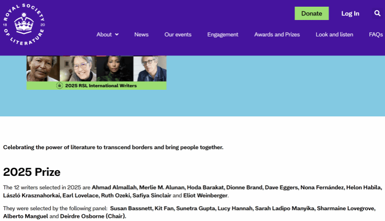 “国际文学奖”是英国皇家文学学会于2020年发起的全球性文学奖项,通过全球遴选对英语文学作出杰出贡献的作家,强调文学跨越国界、凝聚人心的力量。2025年度共有12位作家入选,包括诗人、小说家与散文家等多领域创作者。