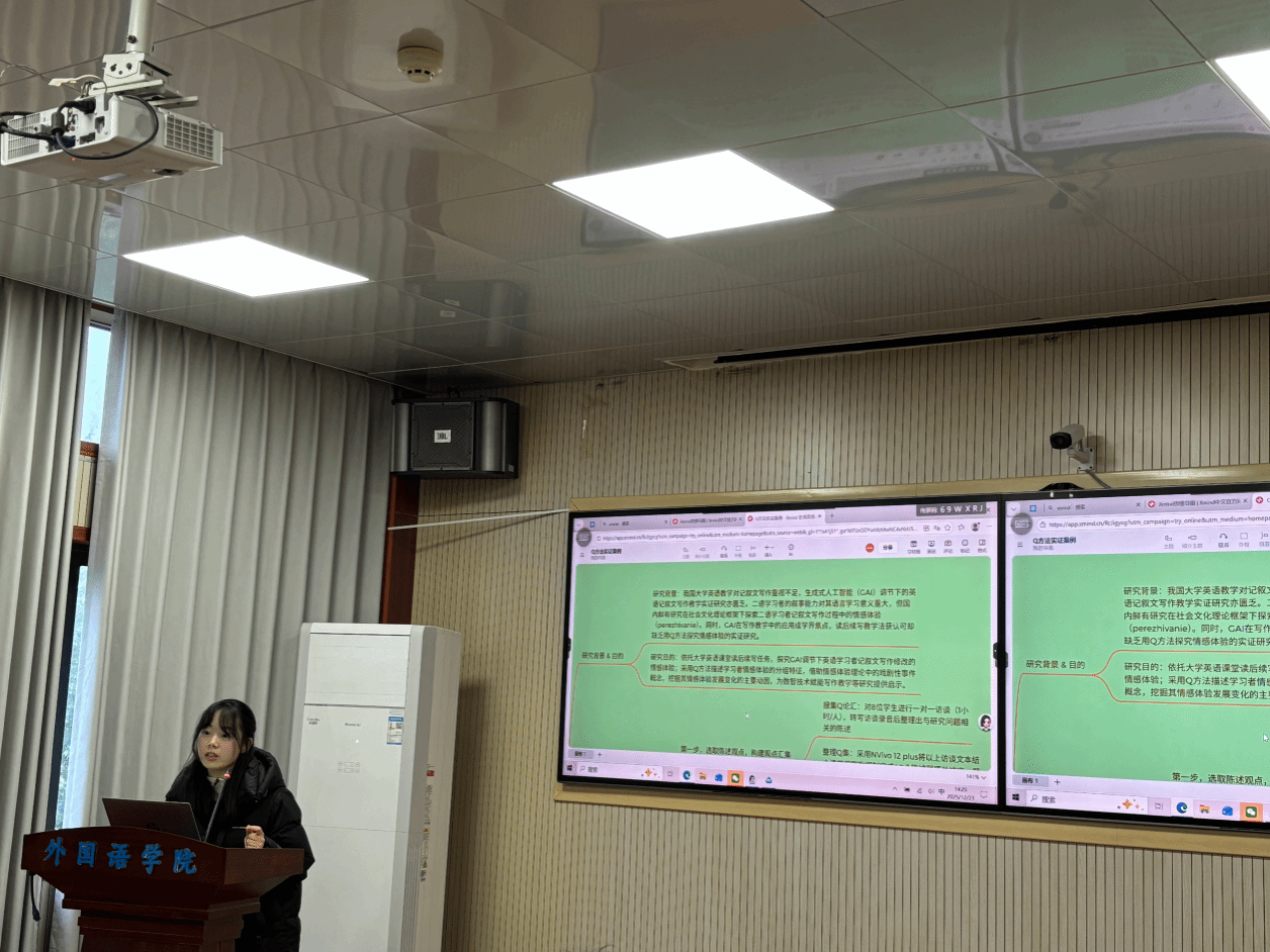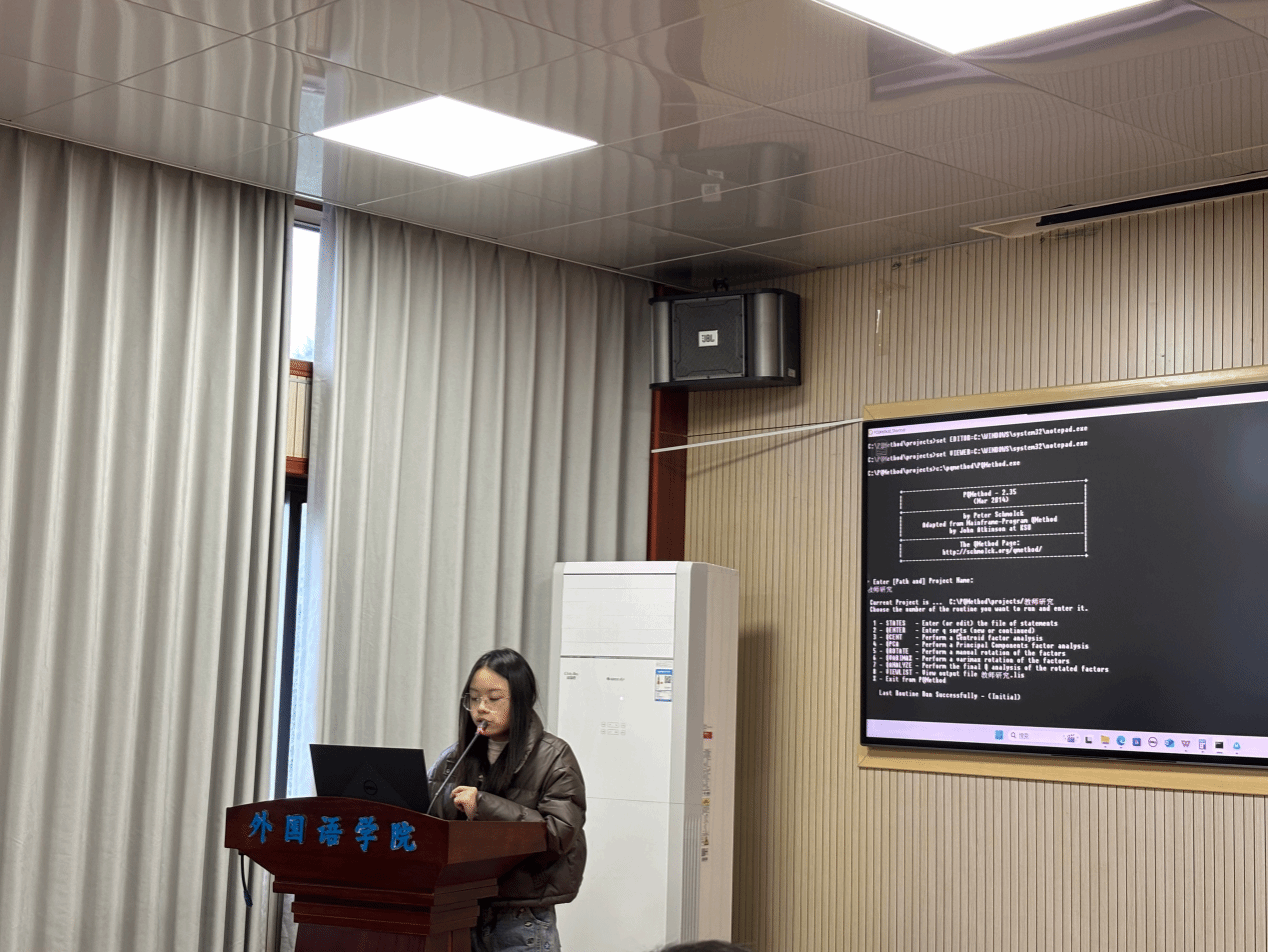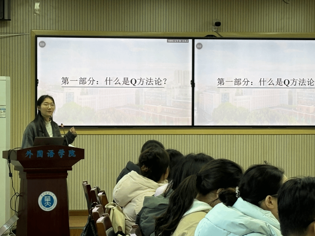 12月23日下午,外国语学院研究生论坛(外语教育方向第26期)暨语思卓越班系列活动在3402教室顺利举办。本次论坛的主题是外语教学研究中的Q方法及其应用,旨在帮助研究生掌握创新研究方法,提高科研素养和学术能力。学科教学方向2024级硕士研究生吴千豪、彭昱臻和李玉巧分别从理论基础、研究示例和操作流程等方面对Q方法的应用做分享,外语教师教育研究中心的闫春梅、余波、杜小双、梅欢等老师以及西班牙语系王健楠老师现场观摩并点评,学科教学方向2025级全体研究生参加,论坛由2025级研究生薛冰橙主持。
