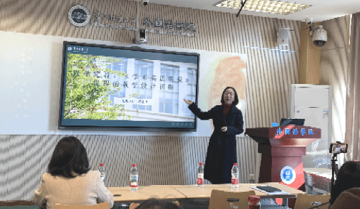 胡金玲老师以《以学定教:学术英语听说课程的教学设计初探》为题,系统阐释了“以学定教”理念。她从课程概况出发,强调教学设计应基于学生学情,并分享了分层听力速记、新闻播报协作等实操案例,生动展示了如何通过精心设计的课堂活动有效提升学生的学术英语听说能力,体现了以学生发展为中心的教学思想。