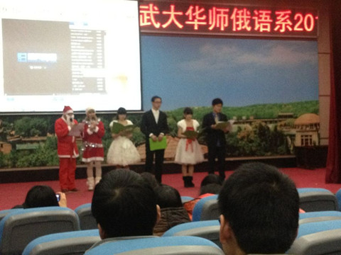 12月29日,第三届武大华师俄语系2013新年联谊会在武汉大学外国语学院大礼堂成功举行。我校俄语系及武汉大学俄语系的领导、老师和全体同学共聚一堂,喜迎新年。晚会由我院俄语系研究生、武汉大学俄语系学生及两校外教共同主持。