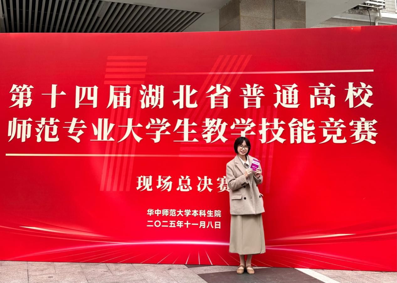 11月8日,第十四届湖北省普通高校师范专业大学生教学技能比赛,外国语学院邹春燕、张丽君老师指导的2023级英语(公费师范)专业本科生林语桐荣获高中英语组一等奖。
