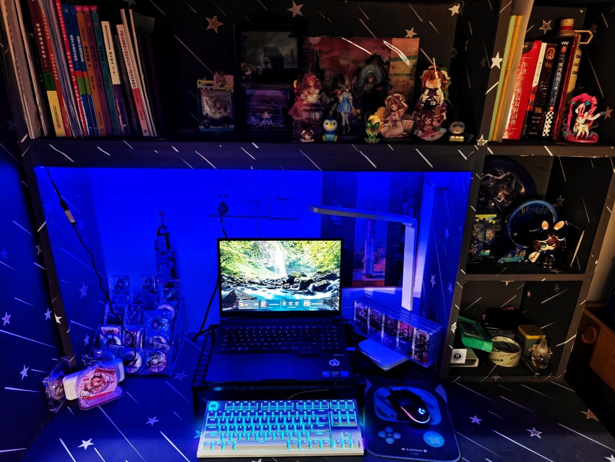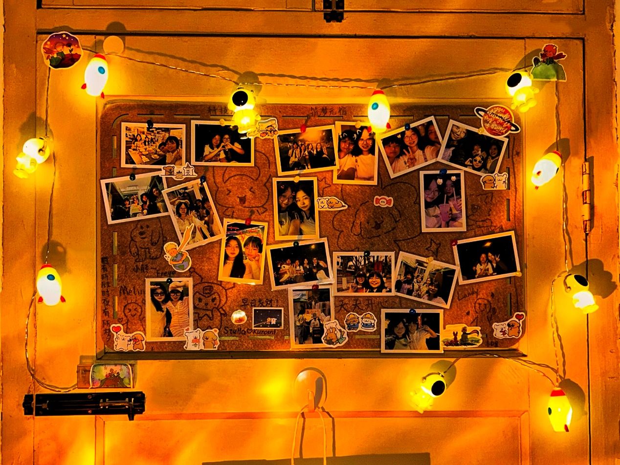 东九625寝室运用智能灯带与声控小灯,打造出富有意趣的居住空间。619寝室通过灯光设计营造出星空效果,展现出积极向上的生活态度。608寝室采用夜光宇宙主题壁纸,并精心设置合照墙,记录室友情谊。