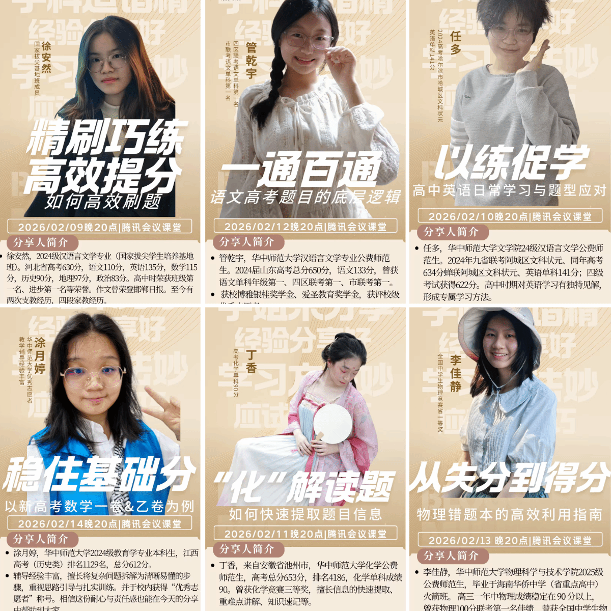 专题讲座于2月9日至14日每晚线上开展,六位主讲人结合自身高考实战经验,围绕各学科核心痛点展开分享:语文组主讲人徐安然主讲“精刷巧练”高效刷题促学习,2024年哈尔滨市阿城区文科状元、语文组主讲人任多分享英语日常学习策略,化学组主讲人丁香创新提出“用语文技巧解化学题”的跨学科方法,高考语文133分获得者、语文组主讲人管乾宇拆解高考语文底层逻辑,物理竞赛省级一等奖获得者李佳静传授错题本“分类诊断”法,语文组主讲人涂月婷针对数学基础分讲解应试提分技巧。