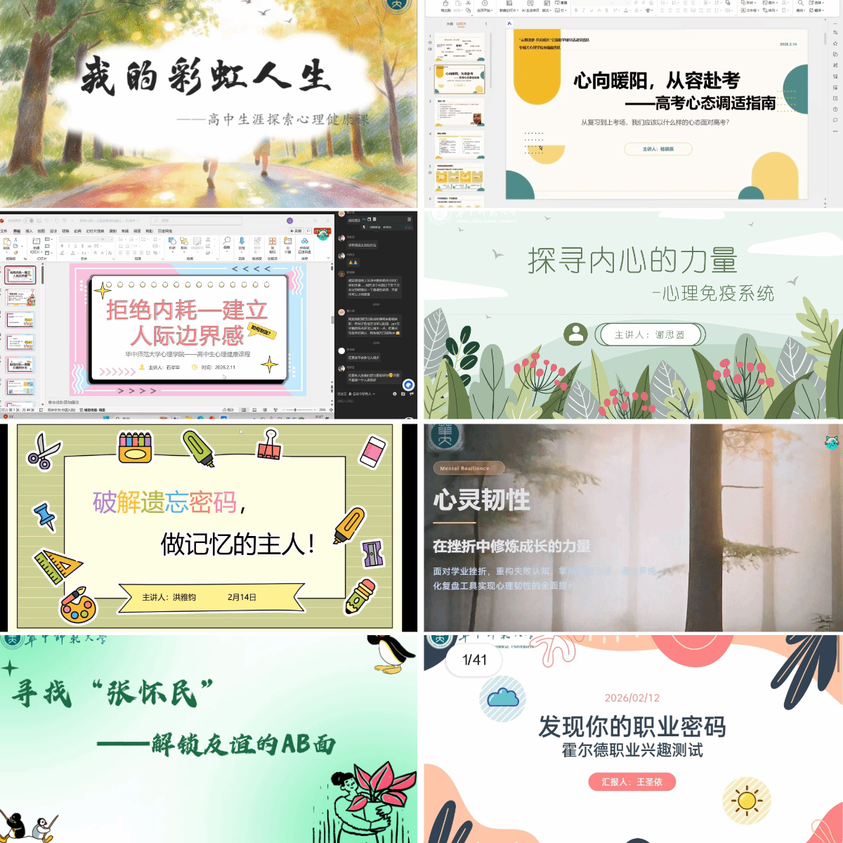 心理教研组紧扣高中生心理发展核心需求,从生涯规划、情绪调适、挫折应对、学习心理、人际关系、自我认知六大维度切入,精心设计16节特色心理课程,历经自主备课、集中指导打磨、课后优化完善的多轮研讨,将抽象的心理学概念转化为贴近学生生活的案例、趣味互动与实用方法,让课程既具有专业性,又精准对接学子实际需求。授课过程中,主讲人以陪伴为核心、以引导为方法,通过沉浸式课堂为学子疏解学习焦虑、指导时间管理、搭建人际沟通桥梁,心理工作坊累计授课时长超16小时,用专业力量为学子的寒假学习筑牢心理防线。
