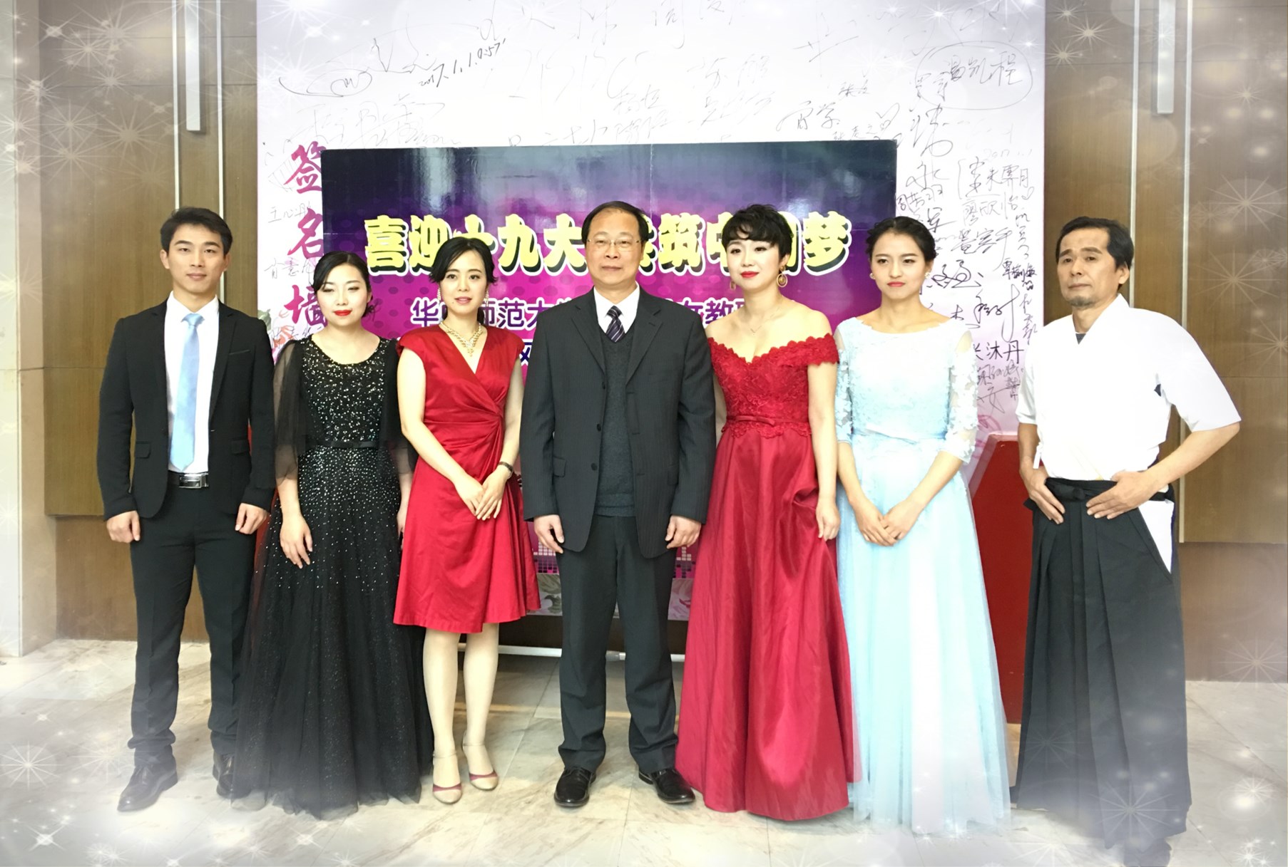 外院是第十个出场队伍,灯光亮起,伴随着缓缓的音乐,率先从舞台两侧缓缓走出的是身着黑色礼服的成雯老师与一袭浅蓝色长裙的潘英子老师,二人端庄大方,气场十足;紧接着出场的是王霞老师与石桥老师,王老师的亮色连衣裙搭配上石桥老师黑白色和服,色彩的鲜明对比中透露出一种别样的视觉美感。最后登台的是一身黑色西服的全先行老师与身着红色长裙的周易老师,男老师简洁帅气,女老师优雅美丽。六位老师一起走到台前,礼服、和服、西装、长裙,不仅展现出了风格各异的美,也体现了外国语学院兼容并包、创新敢为的特色。