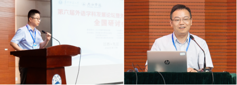 在大会发言环节,广东外语外贸大学副校长刘建达教授就形成性评价和交际语言能力与外语教学改革的关系进行了阐述;闽南师范大学副校长张龙海教授讨论了外国文学课程思政建设与考核的议题;上海外国语大学英文学院院长王欣教授探讨了外语专业研究型教学的改革路径;北京师范大学外国语学院院长苗兴伟教授就国际传播话语体系这一外语学科的新使命进行了阐述;华中科技大学外国语学院院长许明武教授就外语专业人才国际传播能力提升提出了方案;南京师范大学外国语学院院长王永祥教授介绍了南京师大双外语和“外语+”培养模式的实践探索经验;华中师范大学外国语学院董方峰副教授以华中师范大学英语本科专业《综合英语》课程为例介绍了基础课程开展研究型教学的改革经验;海南师范大学外国语学院院长陈义华教授以本院学科建设为例,探讨了新时代地方师范院校外语专业一流专业建设的经验;哈尔滨工业大学外国语学院院长李雪教授分享了哈尔滨工业大学外语课程思政体系建设的思考和实践经验;罗良功教授基于人才自主培养理念,探讨了外语学科人才培养的改革思路,就培养目标、知识结构与课程体系、培养体系、保障体系等进行了阐述。