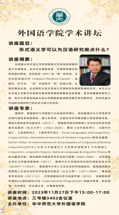 2023年11月27日下午,应外院邀请,香港中文大学语言学及现代语言学讲座教授、中国社科基金重大招标首席专家、北京语言大学潘海华教授,为我们带来一场“形式语义学可以为汉语研究做点什么?”的学术讲座,外院多位老师以及来自外国语言学方向的硕士、博士生等共计30余人参加了本次讲座。