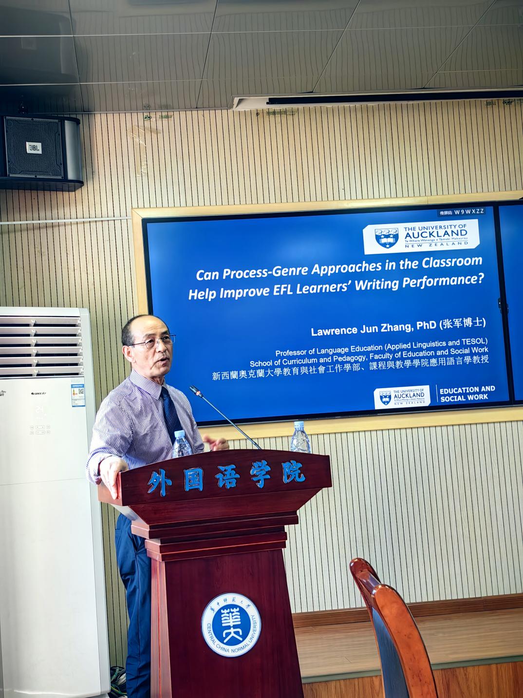 2024年10月11日下午,新西兰奥克兰大学教育学部的副部长及应用语言学博士生导师张军教授(Lawrence Jun Zhang)应邀在外国语学院3402报告厅为外院师生作了题为“Can process-genre approaches in the classroom help improve EFL learners' writing performance?”的学术报告。外国语学院的部分教师及硕博士生积极参与了此次讲座,活动由外国语学院外语教育研究中心主任闫春梅教授主持。