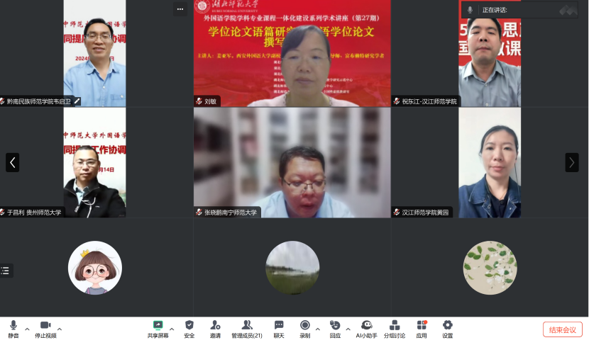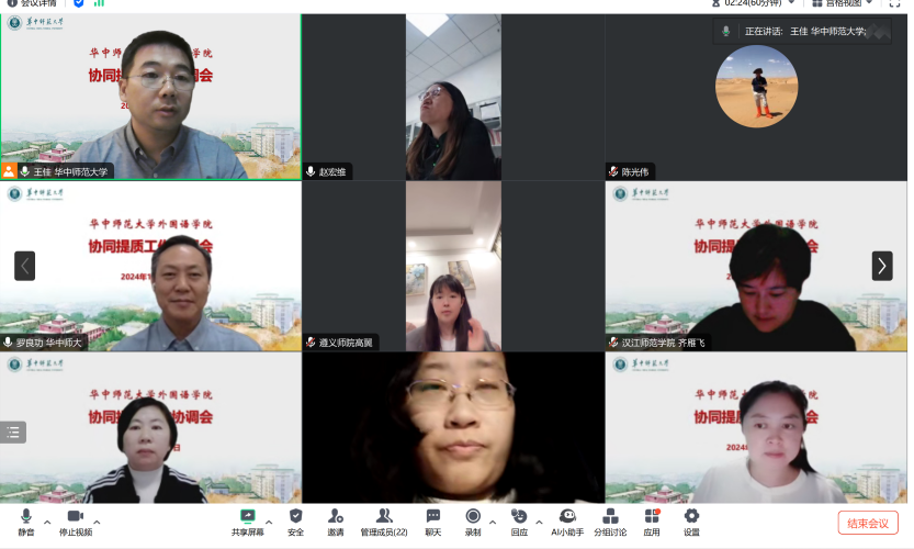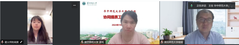 为落实教育部师范教育“协同提质计划”精神和我校工作部署、推动协作单位外语专业建设和事业发展,外国语学院于2024年10月14日晚在线上举行协同提质计划华师组团外语专业工作协调会。会议由罗良功院长主持,湖北师范大学、贵州师范大学、南宁师范大学、汉江师范学院、遵义师范学院、黔南民族师范学院等六所协作单位外语专业主要负责人及骨干教师出席。