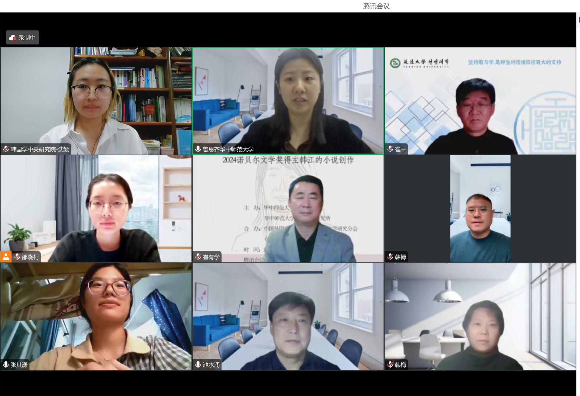 2024年11月16日,以“拷问人性,书写创伤:2024诺贝尔文学奖得主韩江的小说创作”为主题的“韩江论坛”在华中师范大学外国语学院成功举办。本次论坛由华中师范大学外国语学院韩国文化研究所与中国外国文学学会朝鲜-韩国文学研究分会、华中师范大学《外国语文研究》编辑部共同举办。来自北京外国语大学、南京大学、南开大学、延边大学、中央民族大学、山东师范大学、中国社会科学院外研所、广州大学等多所高校、研究机构的专家及研究生相聚云端,共享学术盛宴。