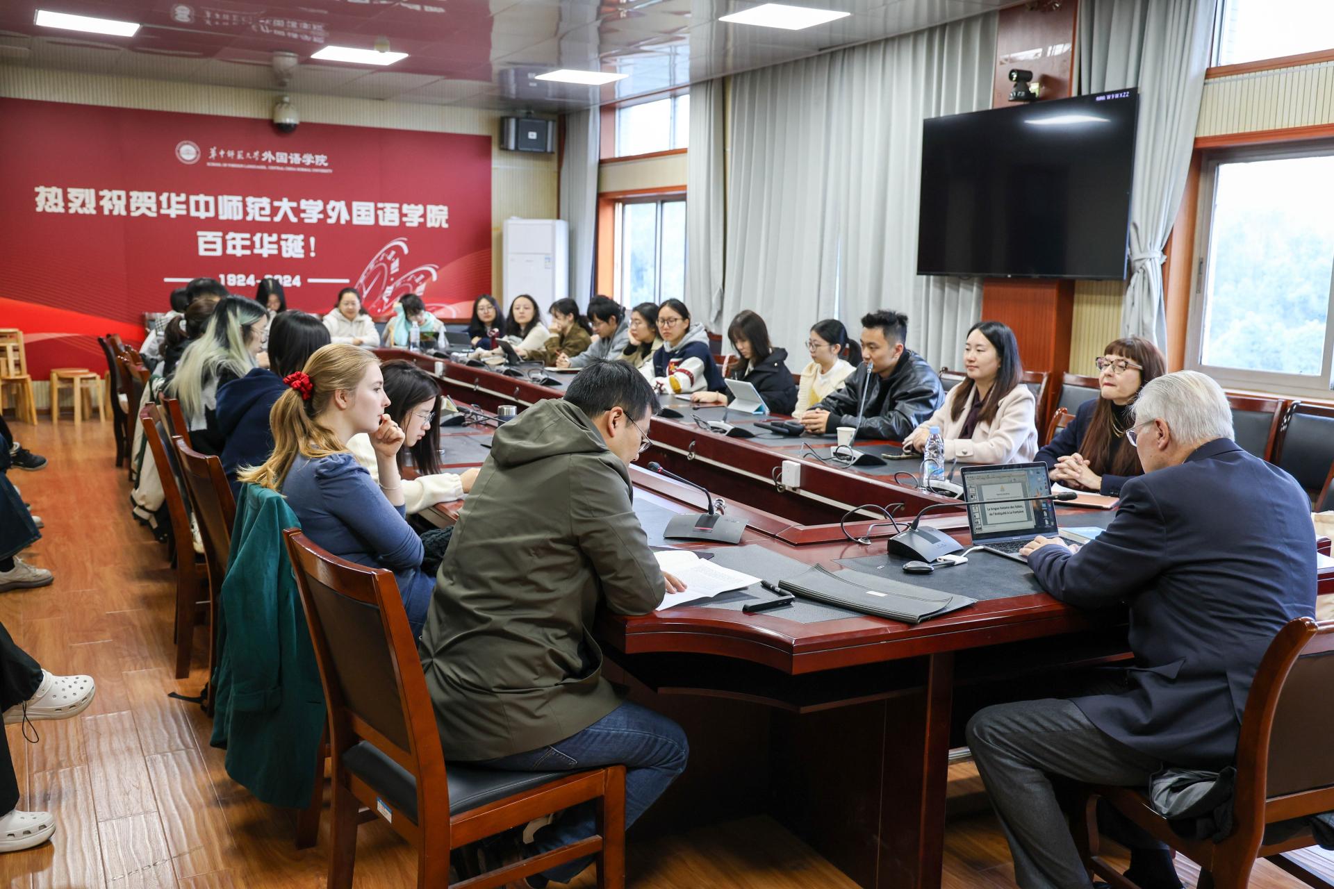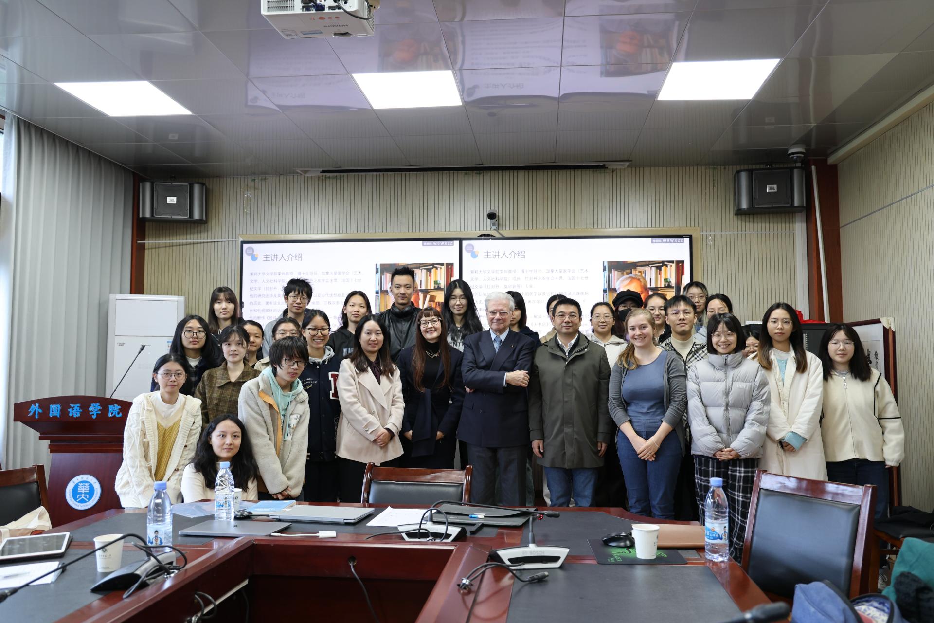2024年11月19日上午,索邦大学文学院荣休教授丹德里(Patrick Dandrey)受邀来我院做学术报告。本场学术报告由法语系承办,由王佳教授主持,外国语学院部分教师和法语系学生参加了报告,报告厅座无虚席。