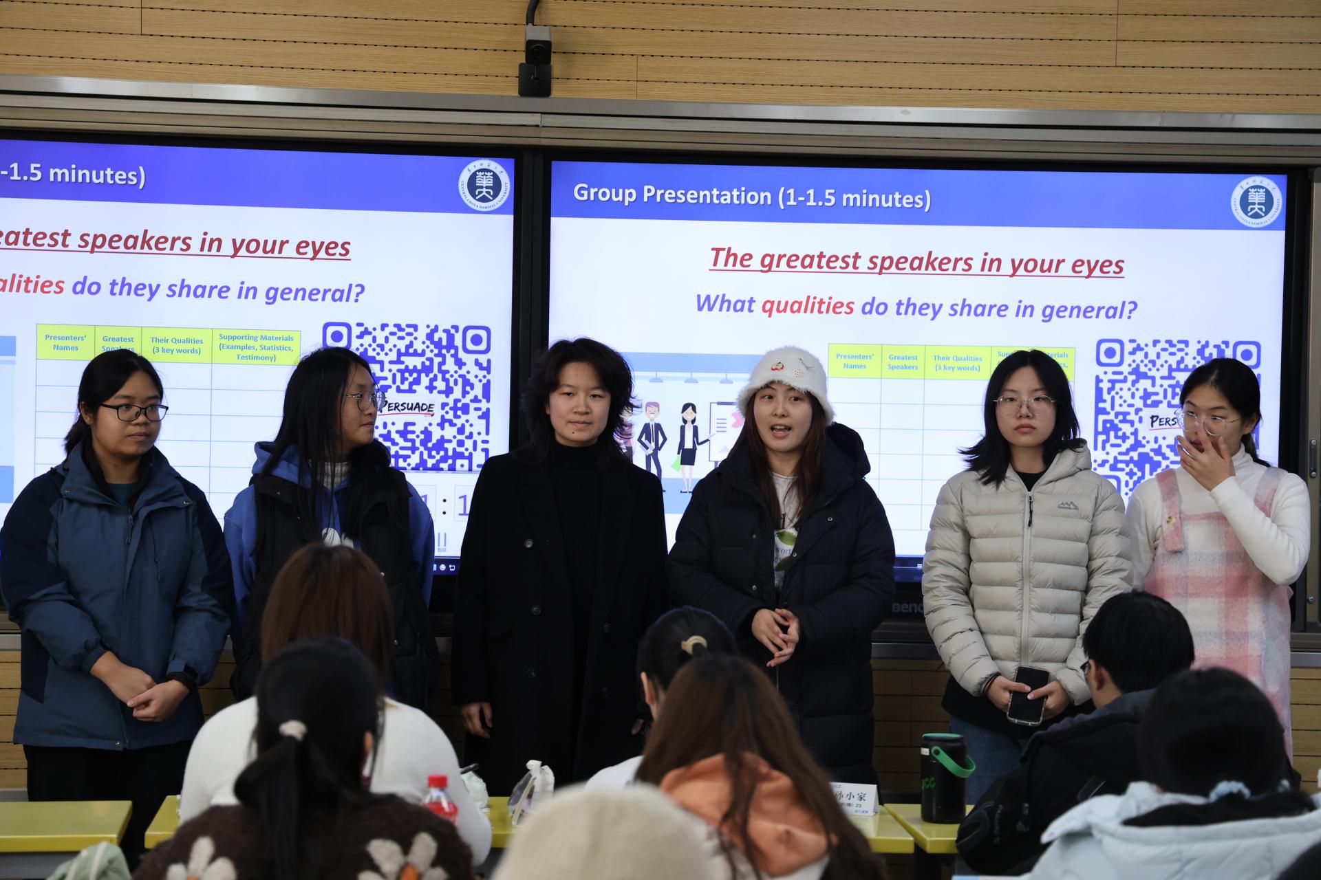 陈志红老师的授课内容为《英语演讲艺术》第十二讲:说服的力量,着眼培养学生“必备素养”—说服力,将学生小组操练与互听互学互评、老师启发引导与讲授有机结合。学生们分组上台展示不仅锻炼学生的英语演讲能力,还能让他们直观体验演讲技巧运用的效果,总结经验教训。真正实现在做中学、在学中思,营造出互相学习、共同进步的良好课堂氛围。