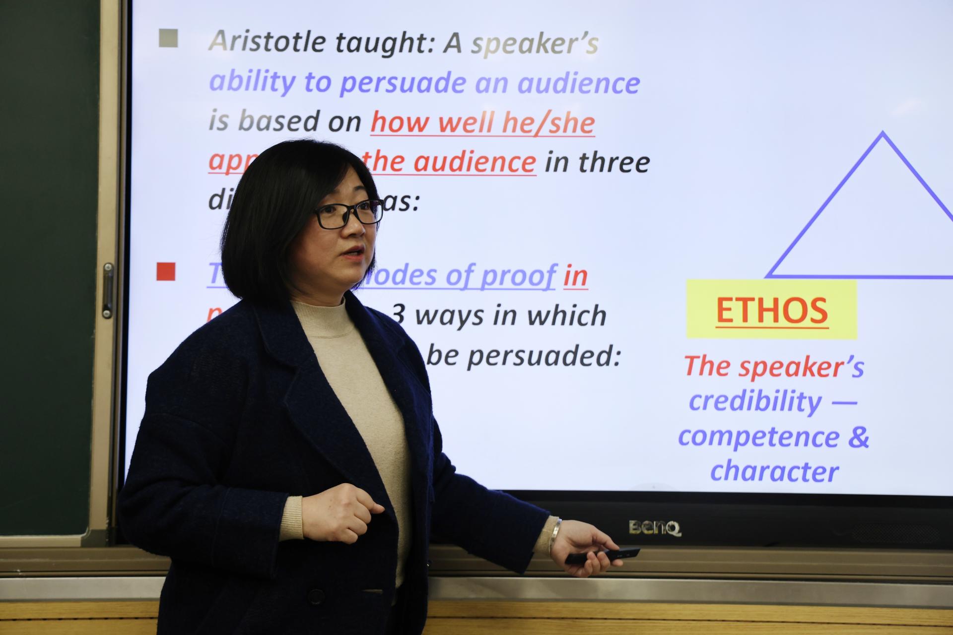 其后,陈老师从经典演讲中脍炙人口的语句中的修辞(rhetoric)入手,追溯演讲的历史起源。结合史上伟大演说家柏拉图、亚里士多德、西塞罗及昆体良等的相关论述为学生们讲解修辞(rhetoric)的概念的发展,将学生在前面互评环节中给与演讲正向评价中的高频词与经典修辞三角的理论框架相印证,引导学生重视修辞三角中“以德服人”的重要性,将理论阐释、历史讲述和思政育人做到了完美融合。