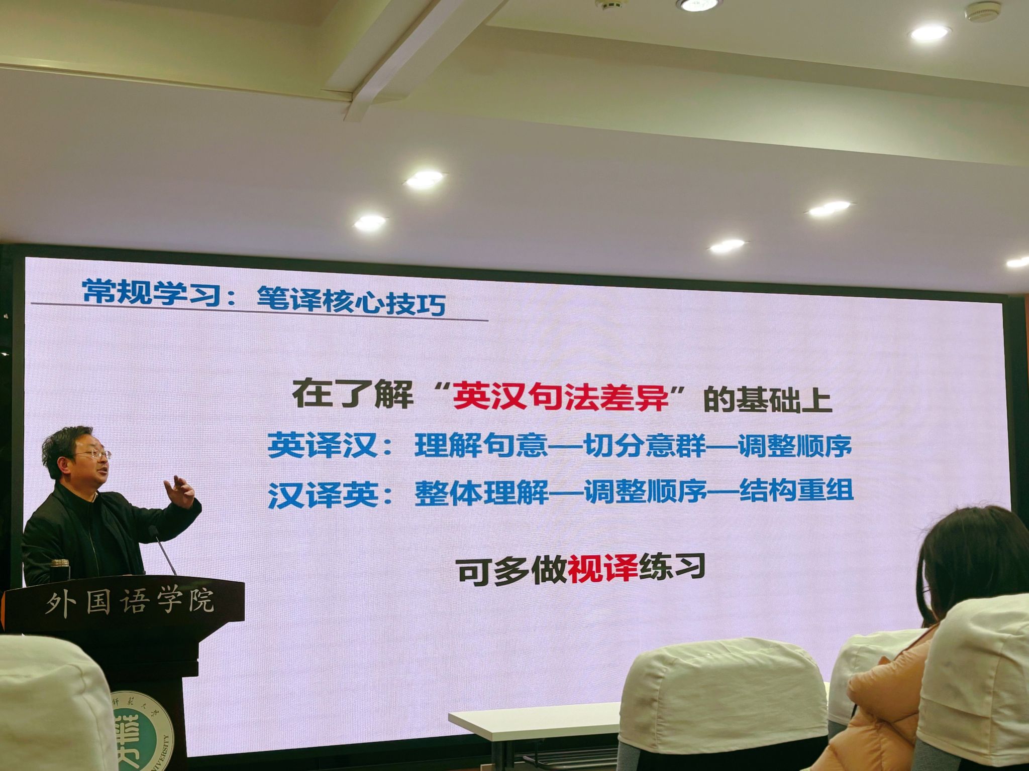 此外,黄敏老师还特别提到,在人工智能逐渐普及的今天,翻译行业面临着前所未有的挑战。AI虽然在某些领域取得了很大的进展,但翻译员仍然需要不断提高自己的跨文化沟通能力、专业领域知识和深度翻译能力,以避免被AI取代。他强调,翻译工作者应将自己的技能提升到更高层次,以适应未来翻译行业发展的需求。