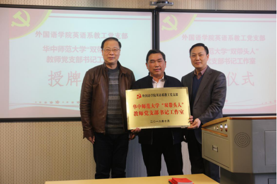3月15日下午,在三号教学楼3406教室举行了外国语学院英语系教师党支部书记“双带头人”工作室授牌仪式。外国语学院党委书记李云同志做主题发言,然后在热烈的气氛中,李云书记和外国语学院党委委员、院长罗良功同志一同将华中师范大学教师党支部书记“双带头人”工作室匾牌授予工作室负责人、英语系教工党支部书记何举纯老师。
