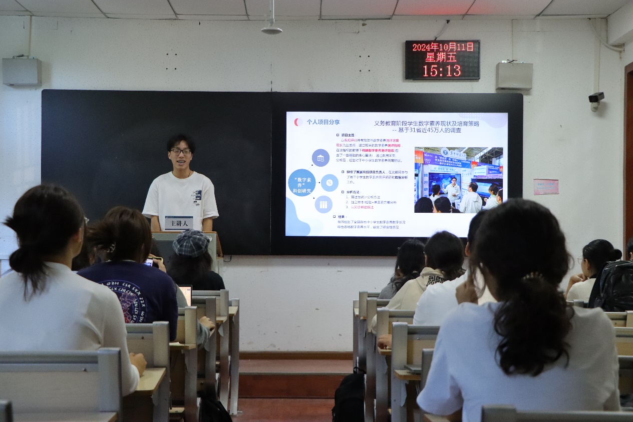 姬高阳以“青年助力科技创新”为主题,从创新创业赛事科普和个人参赛经验两个方面展开分享。他详细介绍了各类赛事的基本信息和不同赛道,耐心解答了同学们有关大学生创新创业训练计划的立项要求、中期检查和结项答辩等方面的疑惑,着重强调了调研问卷设计和数据分析的重要性,并建议参赛者应围绕项目的侧重点进行创新探索。