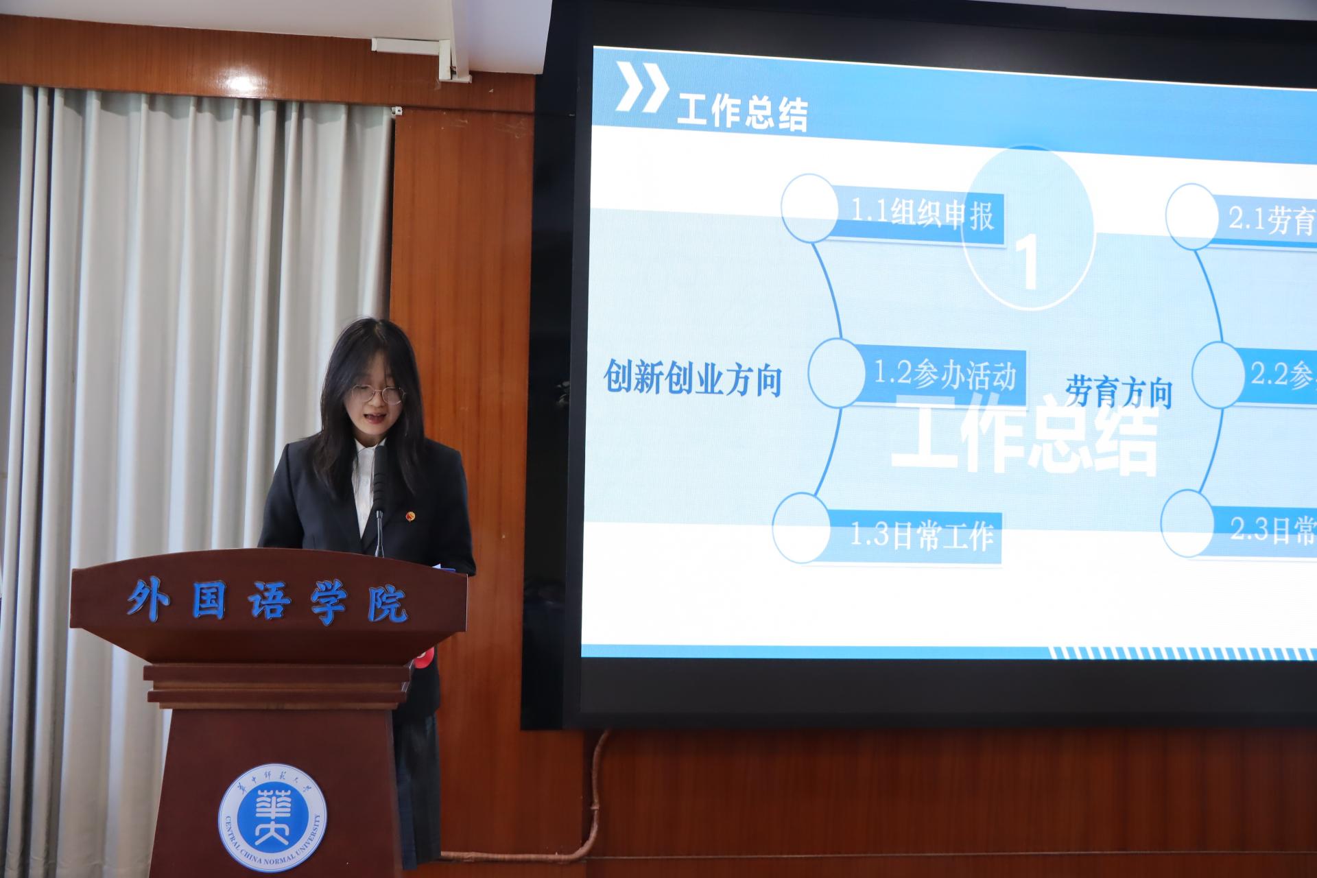 在创新创业与劳育实践中心的工作述职中,刘舒桐从“创新创业”和“劳育实践”两个方向进行了详细报告。在创新创业方面,训练营活动、科学文化节系列活动以及日常工作活动有序开展,为激发学子创新精神和增强实践能力做出努力。在劳育方向,部门承办外文阅读大赛等活动,并表示将继续激发团队活力,深化部门参与,以更好为外院学子地全面发展服务。