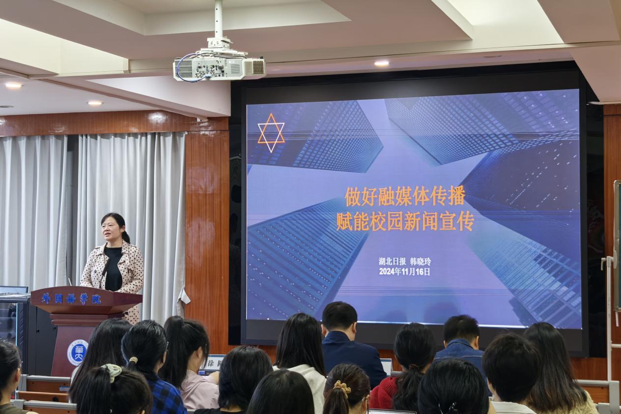 湖北日报高级记者韩晓玲担任专题培训第一讲的主讲嘉宾。作为从事文化、教育报道二十余年的优秀新闻工作者,她围绕着“如何让新时代融媒体传播赋能校园新闻宣传”这一问题,以真实的新闻报道为案例,指出常见的校园新闻宣传误区,并给出相应的建议。她认为新闻宣传工作者应具备良好的新闻宣传能力,秉持实事求是精神,善抓亮点,实现“流量”与“能量”相协调,主动适应融媒体传播新形式。