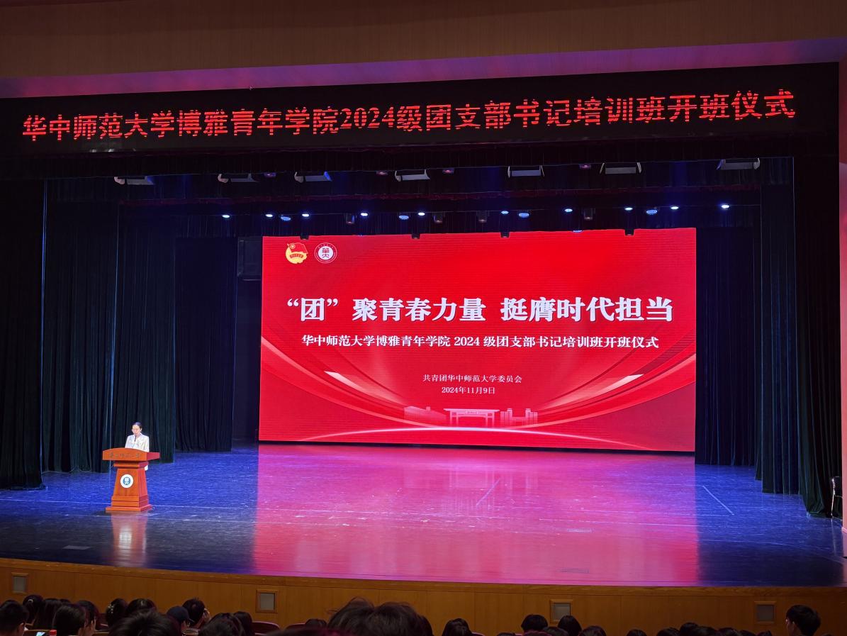 11月9日,华中师范大学博雅青年学院2024级团支部书记培训班开班仪式在大礼堂举行。校团委书记苏晓刚出席并做总结讲话,校团委组织部部长杨颖佳简要介绍培训流程安排,马克思主义学院2024级团支部书记何影作为学员代表发言,校团委副书记(学生)陈晨带领参训学员重温入团誓词。物理科学与技术学院团委书记刘瑾芮、外国语学院团委书记吴波及学校2024级全体团支部书记参加开班仪式。