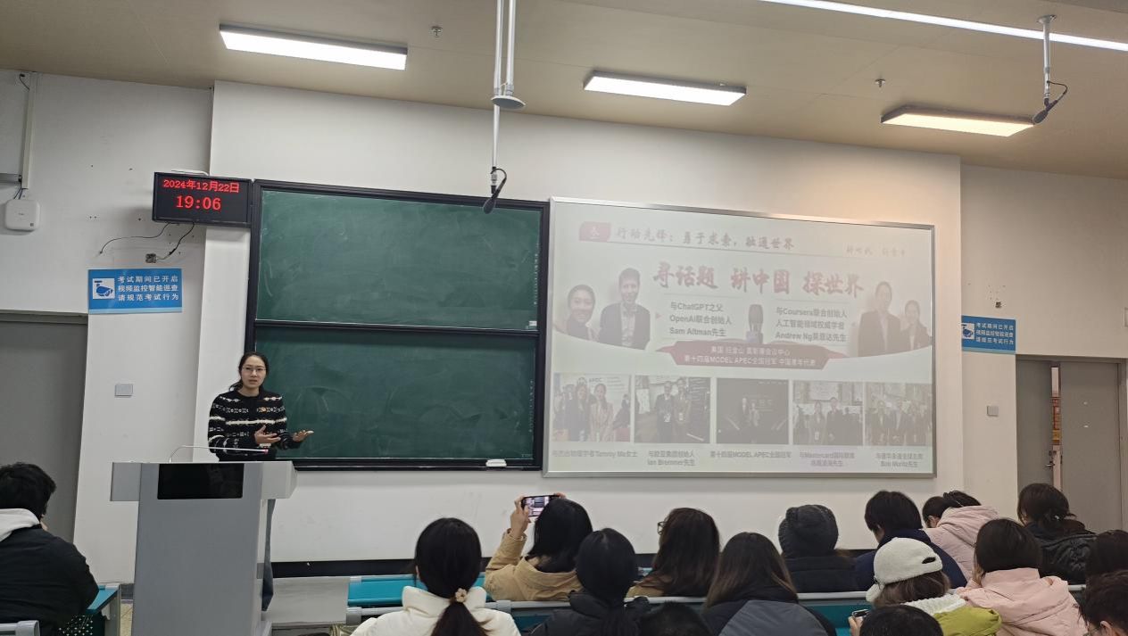最后,邬丽婷以 “行动先锋,勇于求索,融通世界” 为主题,分享了自己参加2023年亚太经合组织(APEC)领导人非正式会议、“长江・密西西比河” 中美青年圆桌会以及全国大学生职业规划大赛等活动的宝贵经历。她用这些经历阐明了热爱与坚持的力量,鼓励同学们在面对困难和挑战时,要坚定信念,勇于追求梦想,通过不懈奋斗实现有意义的人生。团课以习近平总书记在北京大学座谈会上的重要讲话精神为指引圆满结束,邬丽婷再次强调了青年要爱国、励志、求真、力行,为同学们指明了未来的努力方向。
