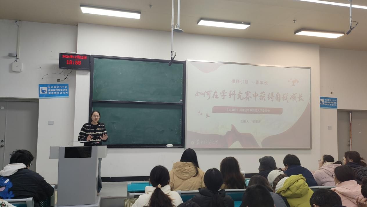 12月22日,“榜样引领·青年说”成长故事分享主题团课在8106教室开展。本次团课邀请我校青年典型、外国语学院2021级英语系邬丽婷主讲,讲授主题为“榜样引领青年说——如何在学科竞赛中获得自我成长”。团课由外国语学院团委书记、2022级英语系辅导员吴波老师主持。外国语学院2022级英语系全体本科生参加学习。